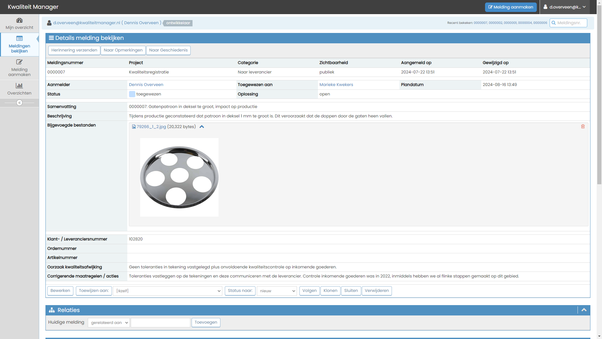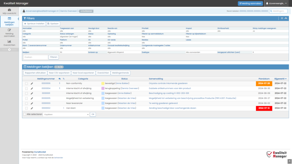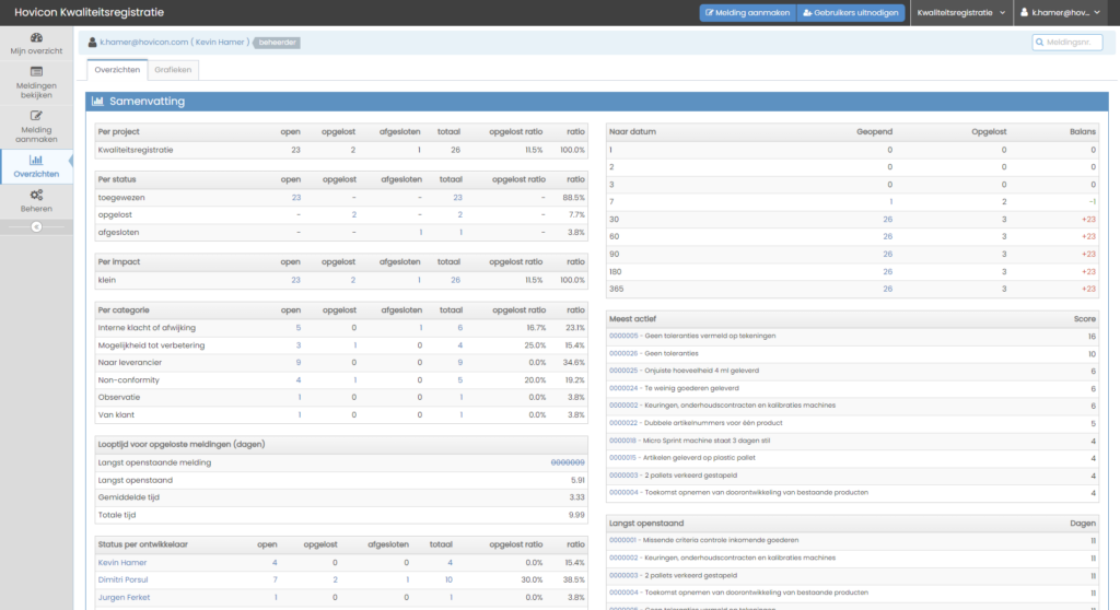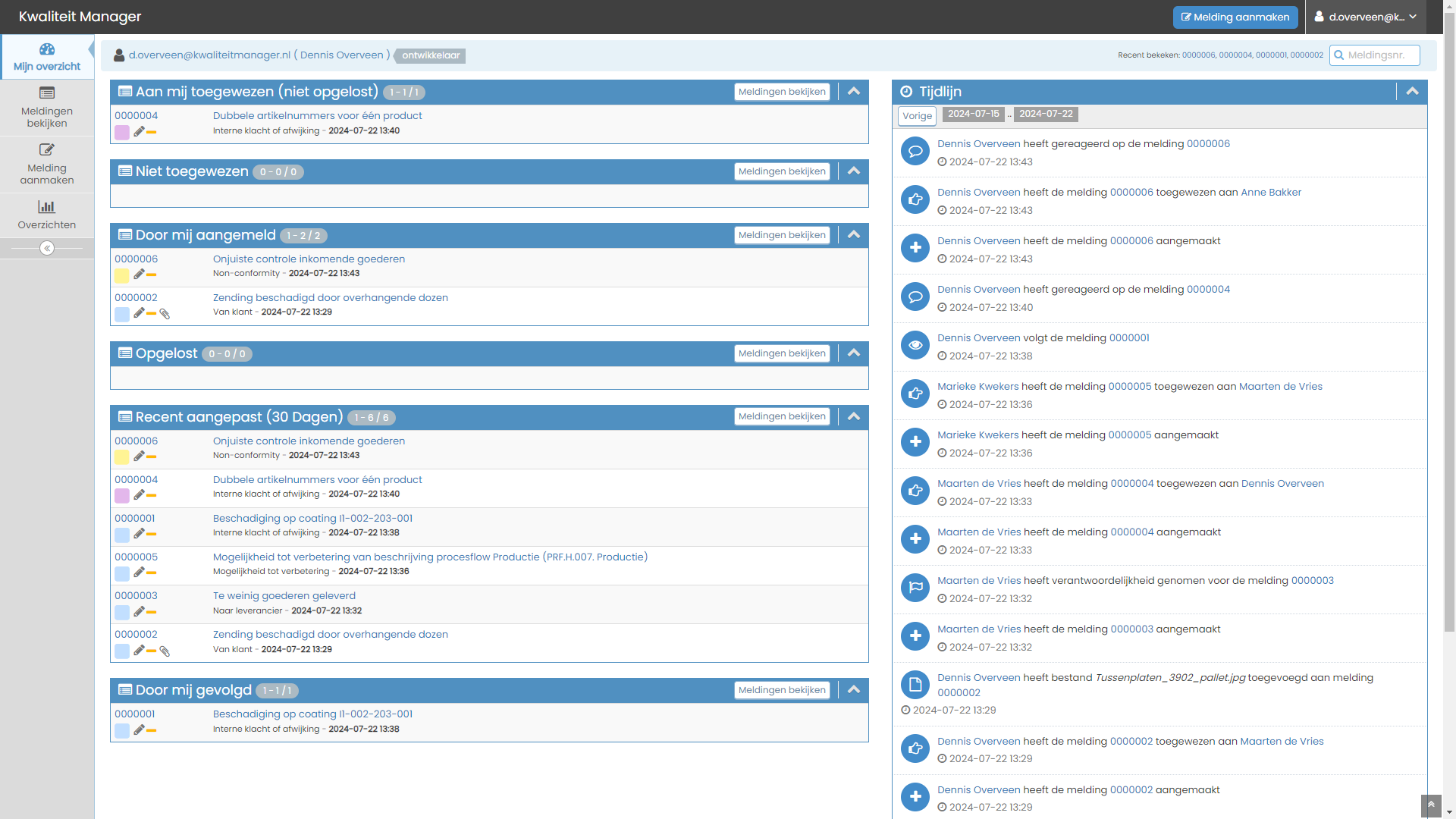 Het overzichtelijke dashboard toont tabs zoals ‘Toegewezen aan mij’, ‘Niet toegewezen’ en ‘Gerapporteerd door mij’, zodat gebruikers direct toegang hebben tot relevante informatie en hun werkdag efficiënt kunnen beginnen.